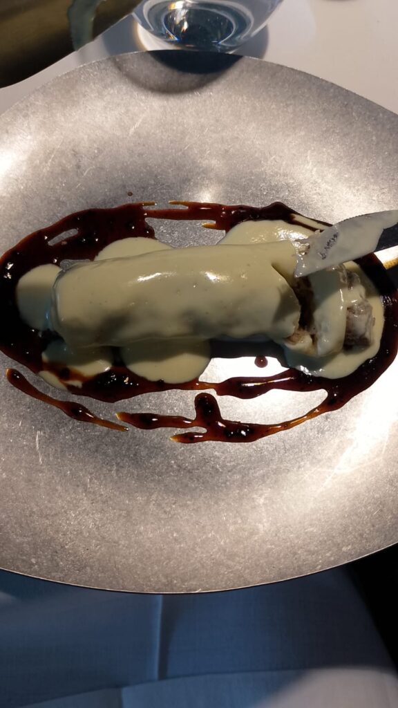 Després dels primers, la cosa va seguir pujant de nivell amb els principals. Vam tastar el caneló rostit de cérvol amb foie i salsa Perigord i, de veritat, estava brutal; tenia un gust intens, d’aquells que et omplen la boca, i la combinació amb el foie mai falla. També ens van portar un arròs sec de pagès amb llebre i tirabecs, que el serveixen directament a la paellera per a dos; l’arròs estava al seu punt i la llebre li donava un toc de caça molt autèntic que ens va agradar molt.
