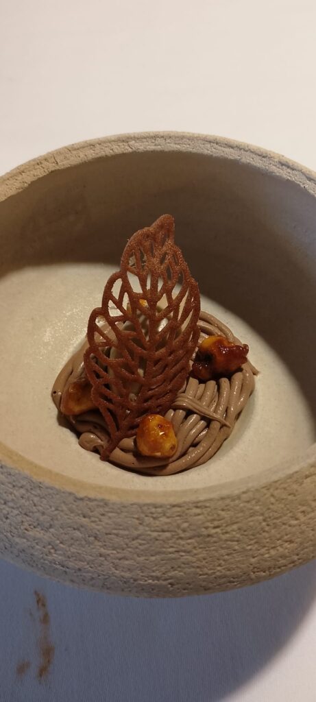 Primer va caure el pijama reinventat. Saps el pijama de tota la vida? Doncs no s’hi assemblava gens visualment però de gust… buf. Portava com un lingote que juraria que era un tocinet de cel que es desfeia a la boca, una passada. Després hi havia un altre postre de xocolata que ara mateix no em surt el nom, soc un desastre, però el que em va flipar de veritat va ser la textura de la fulla que portava a sobre; era súper cruixent i li donava el punt perfecte.